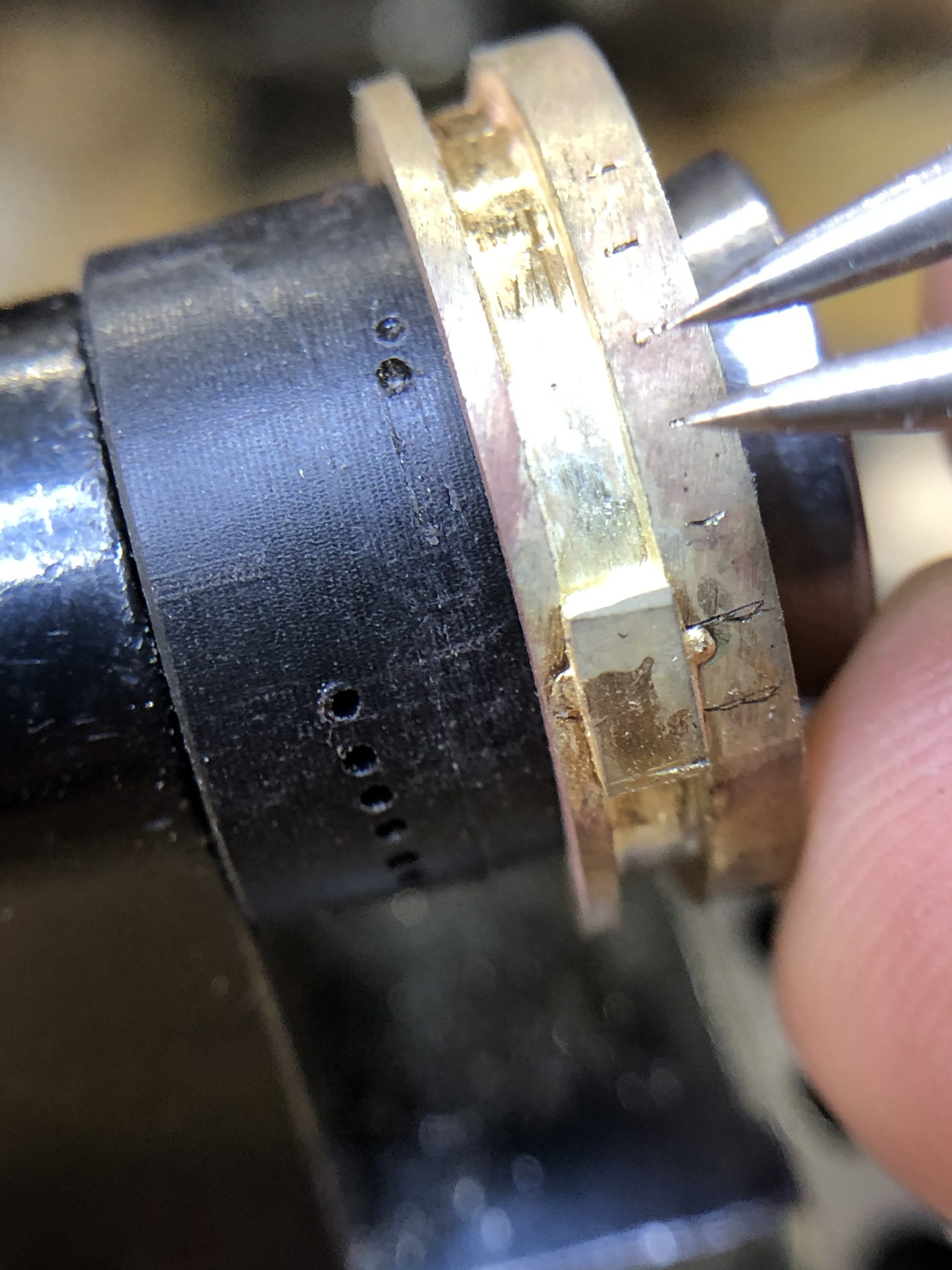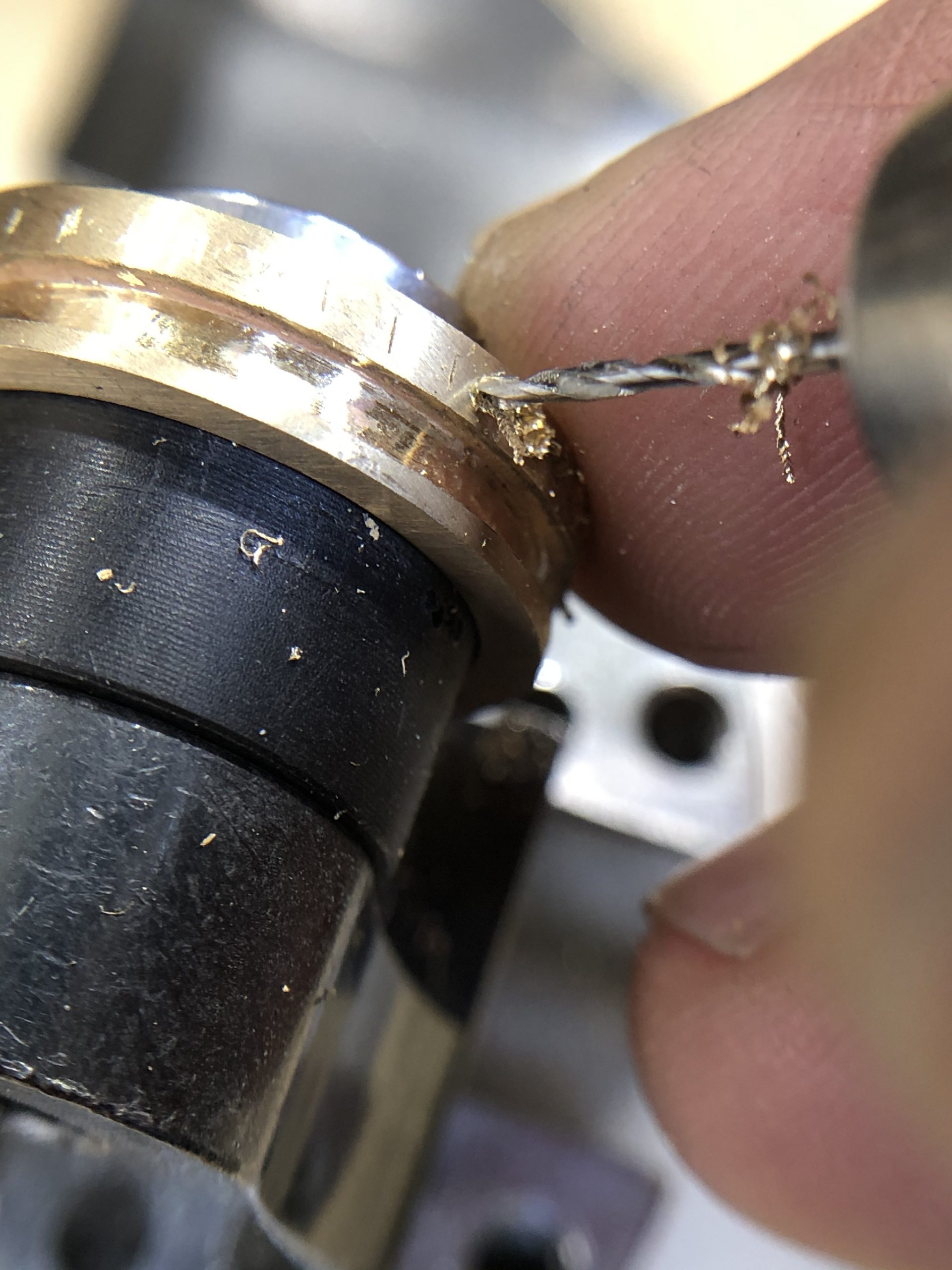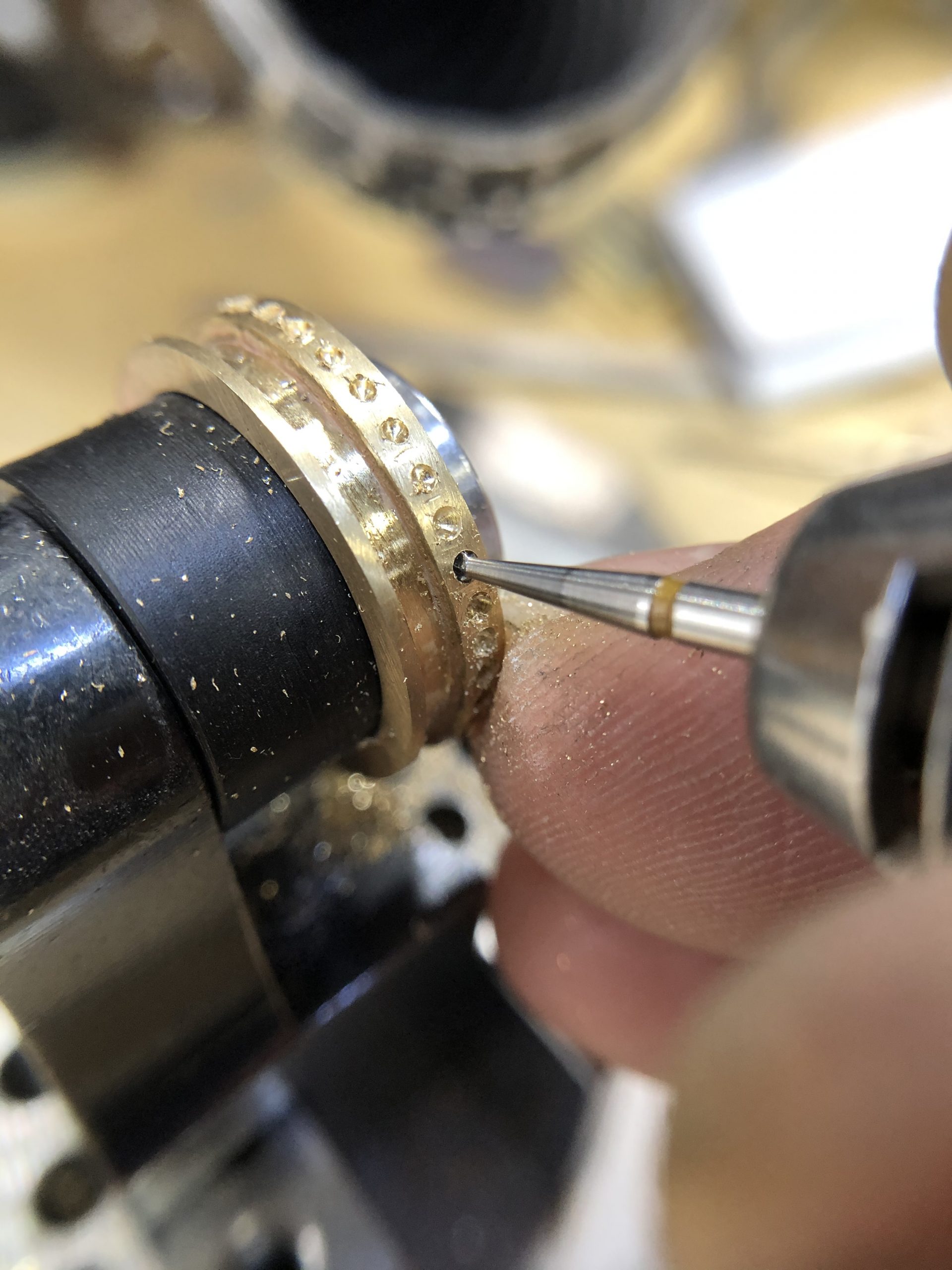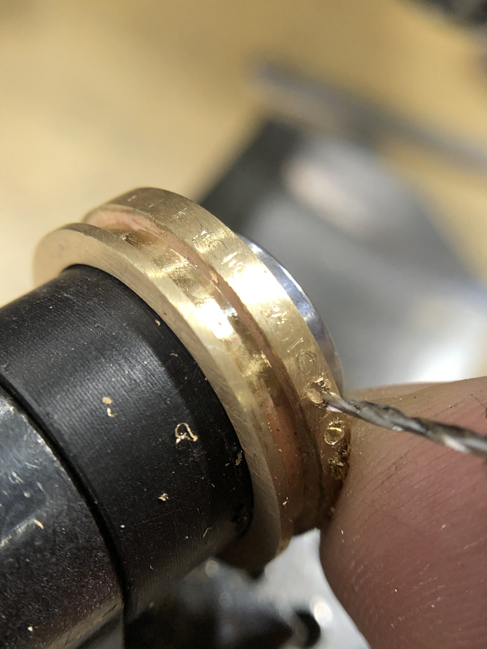 Bij de foto’s zie je hoe de ring gemaakt is. Er is gebruik gemaakt van de verloren was methode, de ring is eerst in was gemaakt op de draaibank.