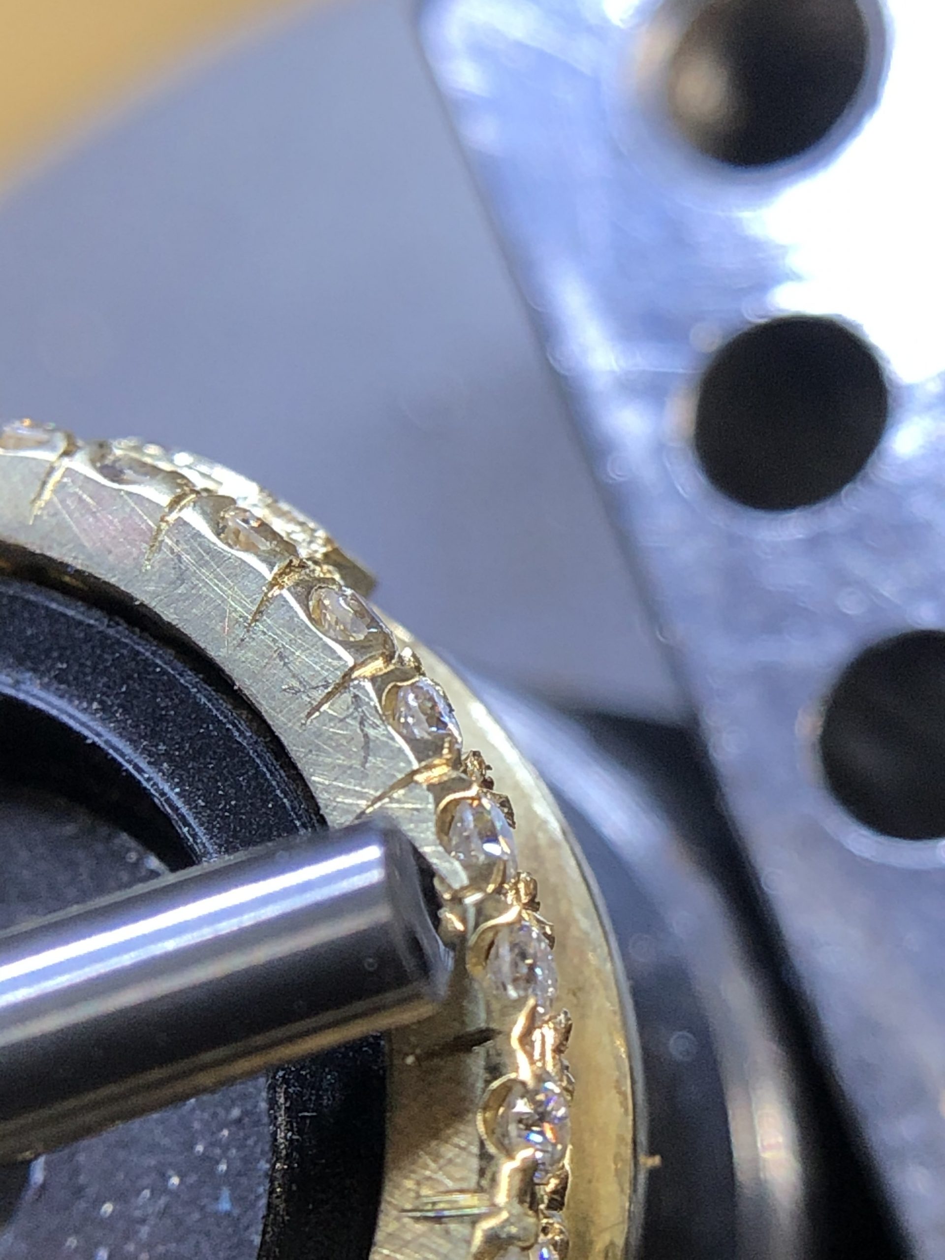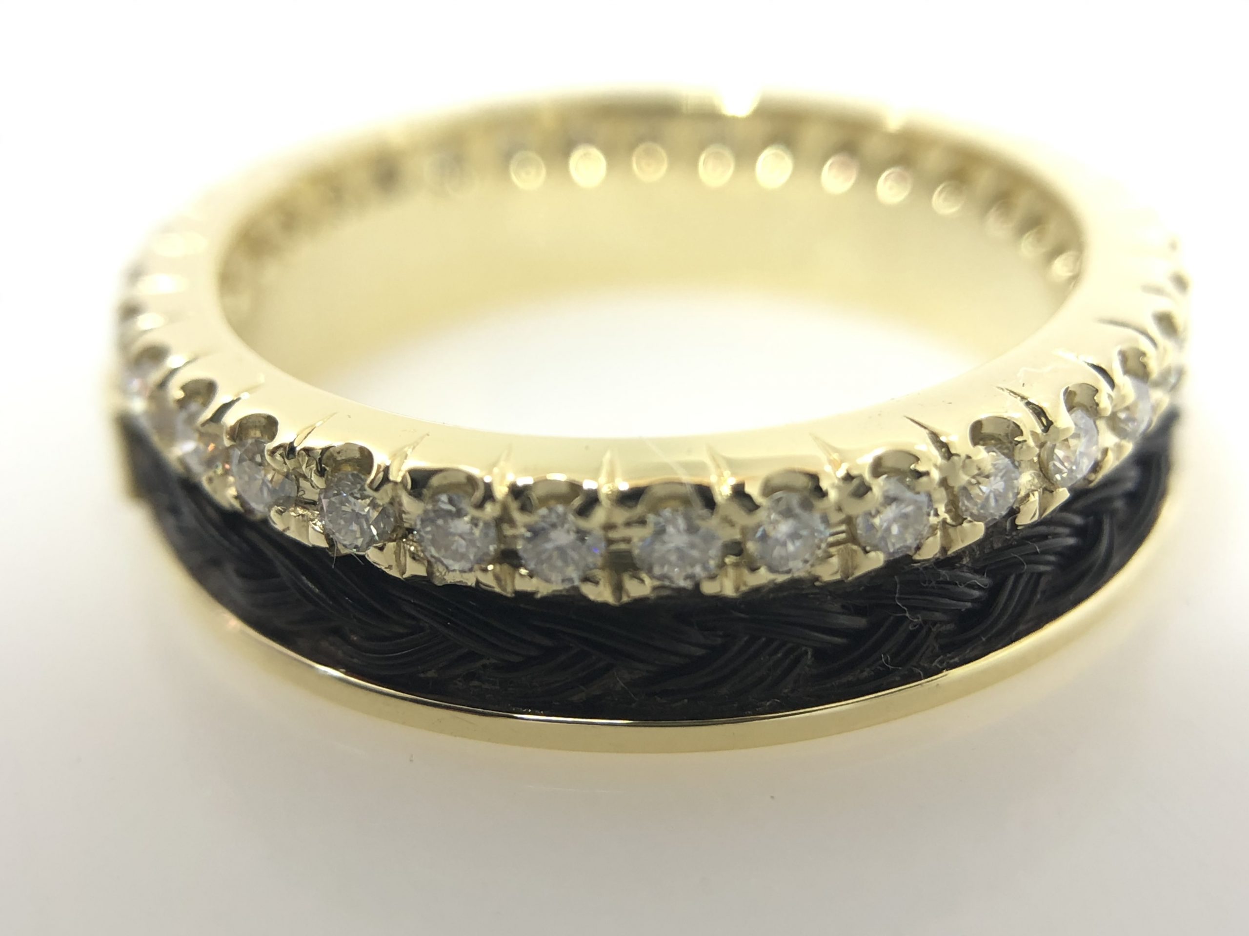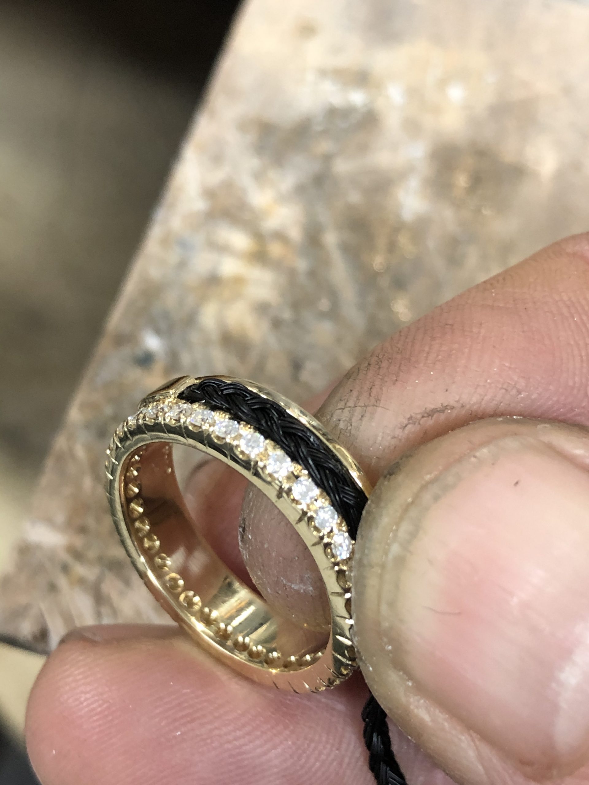 De ring wordt met de hand afgewerkt naar een glanzend eindresultaat en elk steentje wordt per stuk gezet in het goud.
