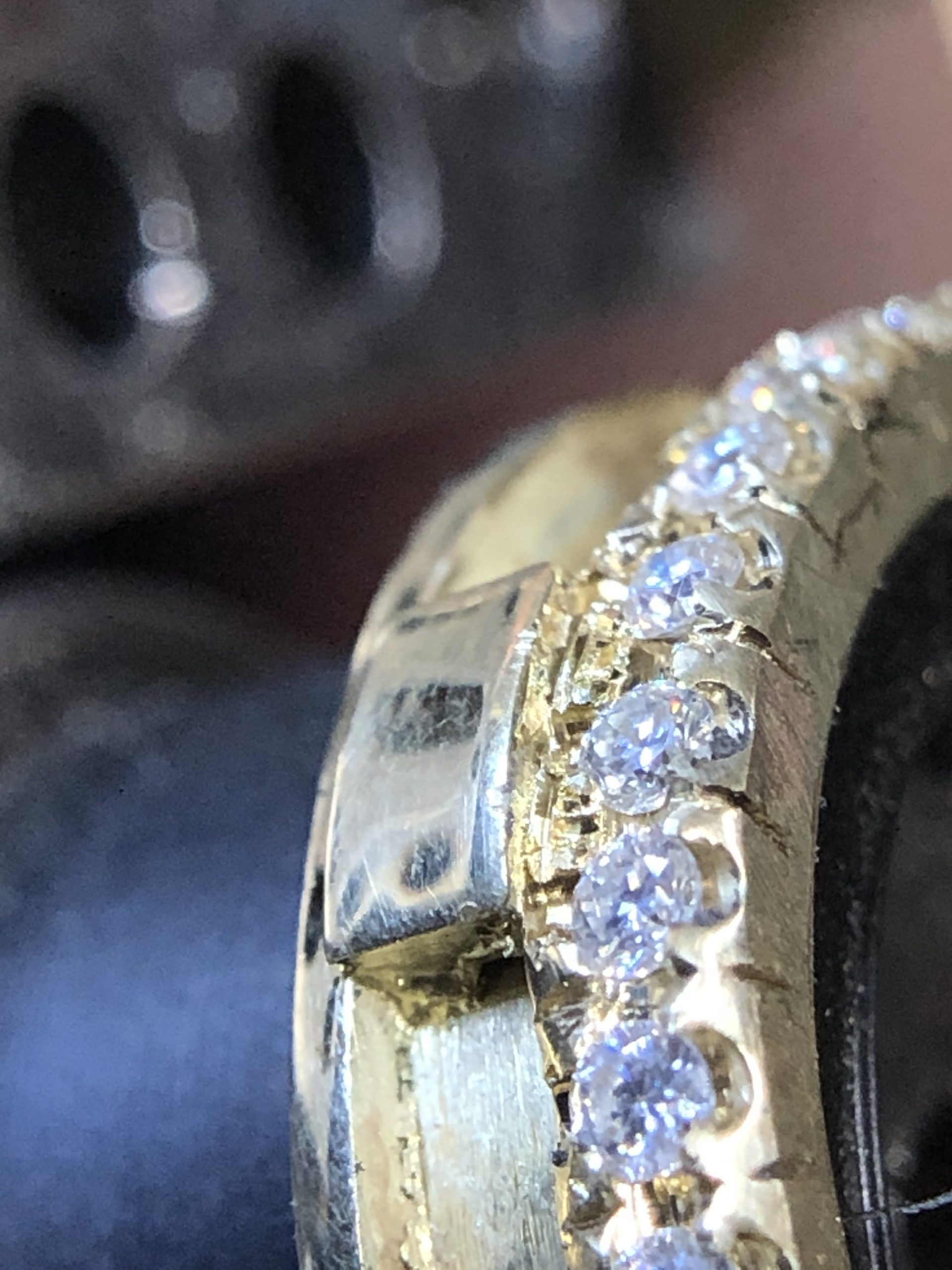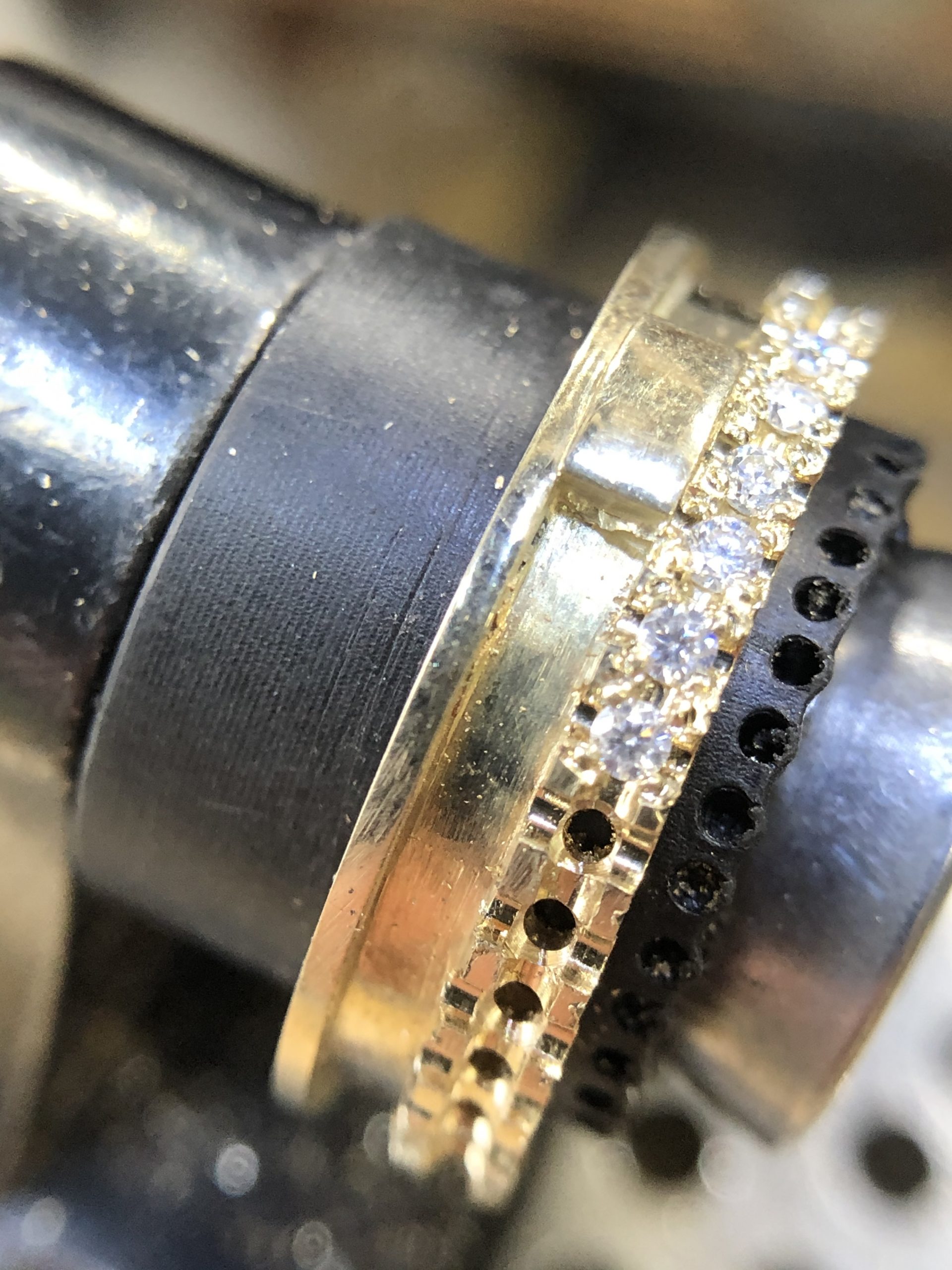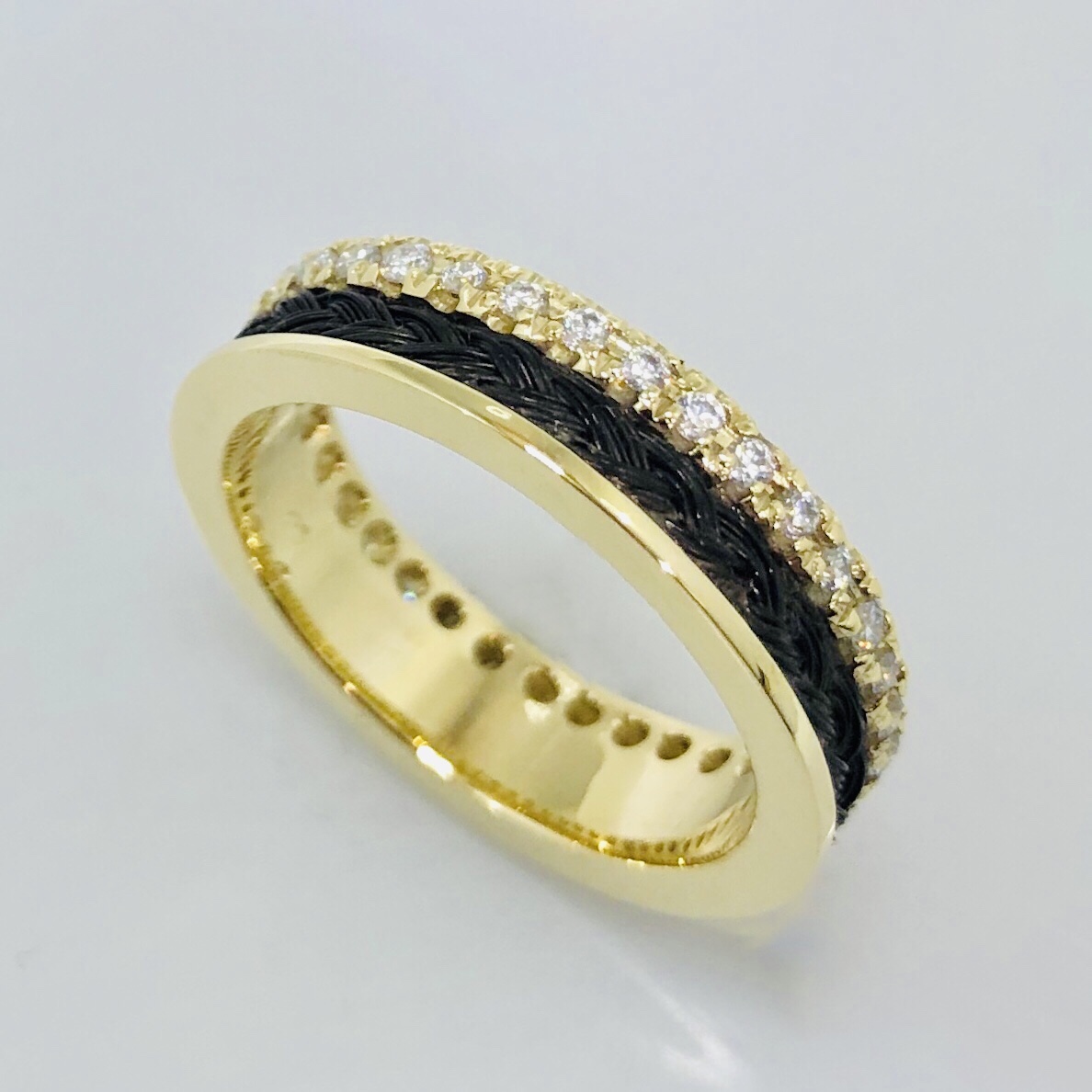 De ring wordt met de hand afgewerkt naar een glanzend eindresultaat en elk steentje wordt per stuk gezet in het goud.