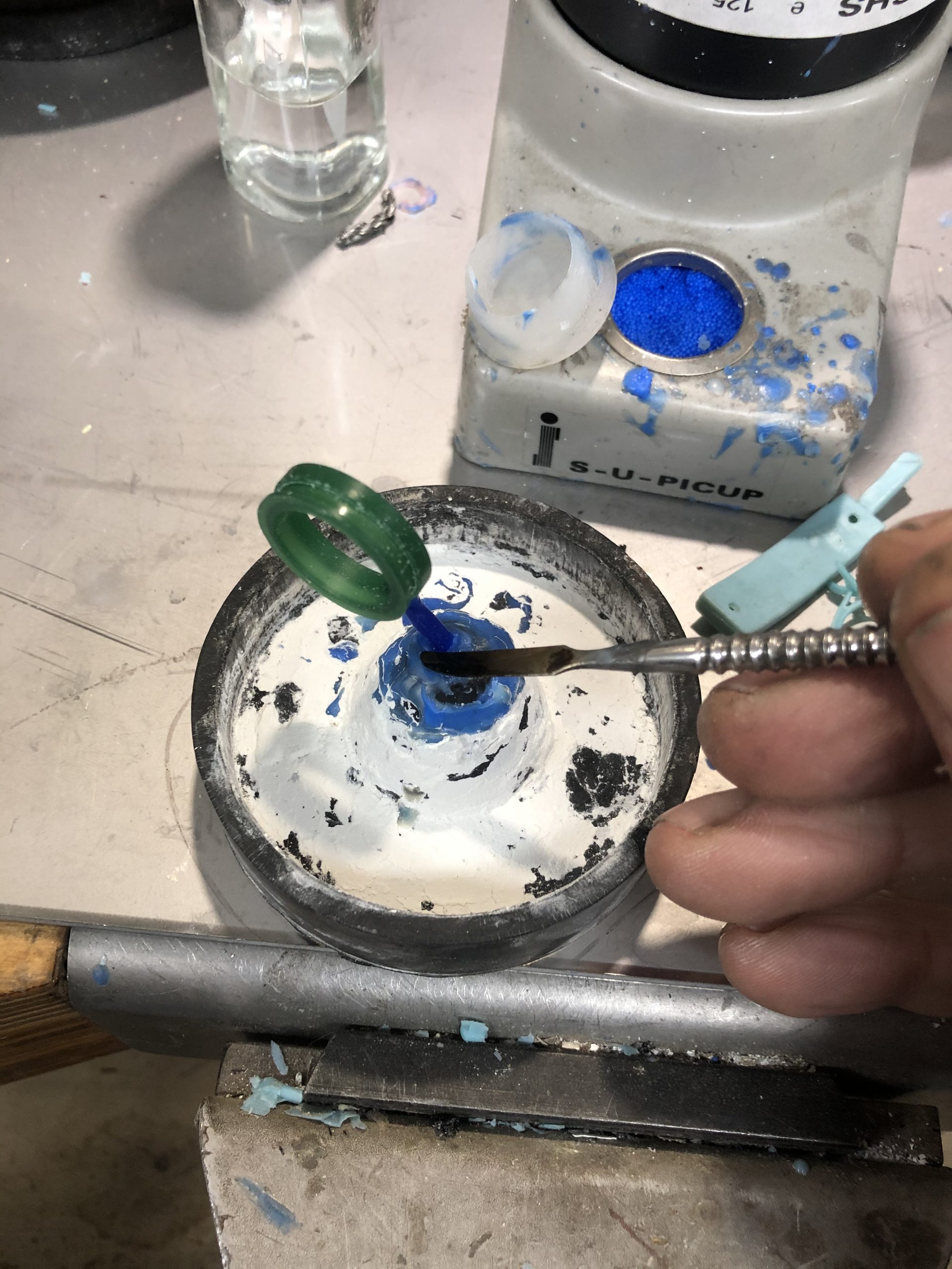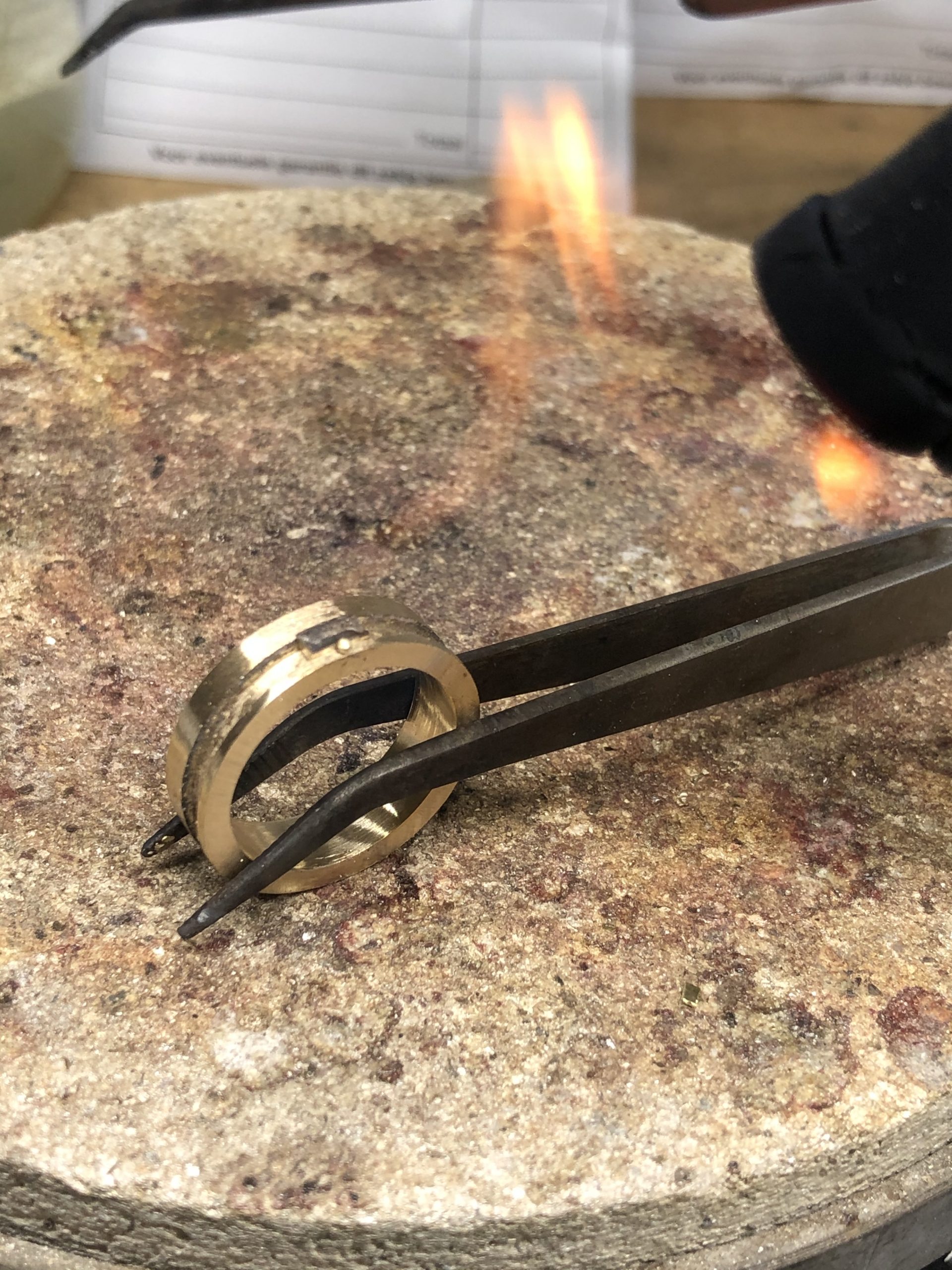Hierna wordt er een gipsen mal van gemaakt en in de oven wordt de was eruit gebrand. De ontstane holle ruimte wordt opgevuld met goud.