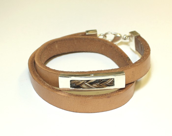 Lichtbruin leren band. Op het dikke leer van 1 cm breed en 3,3 mm dik zit een zwaar zilveren houder voor de paardenharen bevestigd. Ook de uiteinden en de sluiting is weer van 1e gehalte zilver en zeer degelijk uitgevoerd.De leren armband moet dubbel om de arm.
