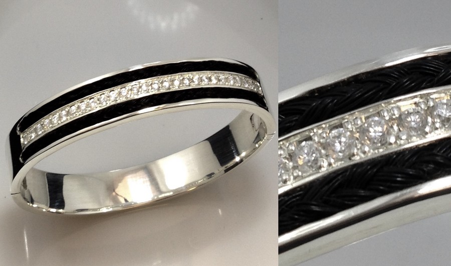 Massief zilveren slavenarmband met twee strengen gevlochten maan-/staarthaar erin verwerkt. Deze armband is 10 mm breed en 3 mm dik en heeft een scharnier sluiting. In het midden is een rij zirkonia’s gezet.