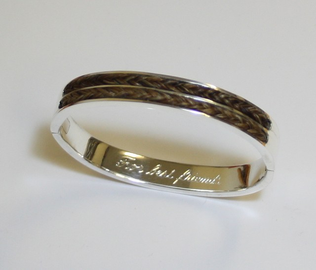 Massief zilveren slavenarmband met TWEE strengen gevlochten maan-/staarthaar erin verwerkt.
