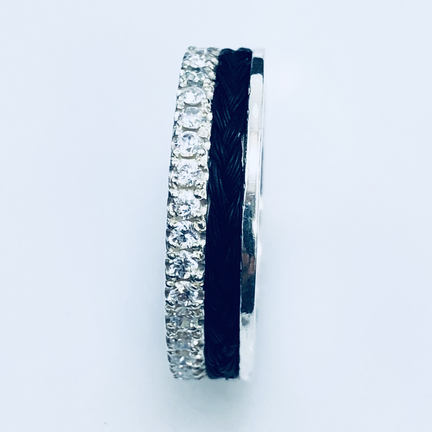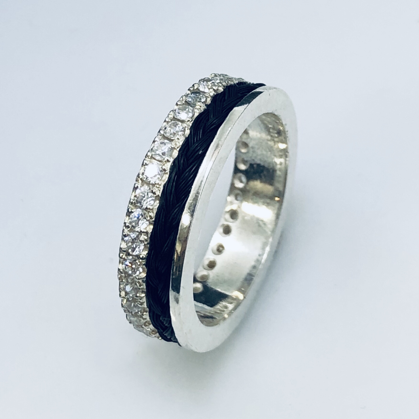 Zilveren ring met een rij zirkonia helemaal rondom gezet. Hierdoor fonkelt deze ring je tegemoet en blijf je ernaar kijken.
