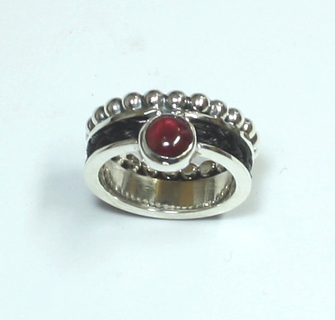 Zilveren ring met prachtige cabochon geslepen granaat, de zijkant is mooi afgewerkt met zilver pareldraad.