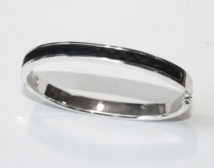 Een massief zilveren spangarmband met een streng gevlochten maan-/staarthaar erin verwerkt. Deze armband is verkrijgbaar in 4.5 mm of 7 mm breed en heeft een scharnier sluiting. De armband is nu standaard met een extra lange vlecht. Ook zit er extra, naast de gewone sluiting, een veiligheids sluiting op.